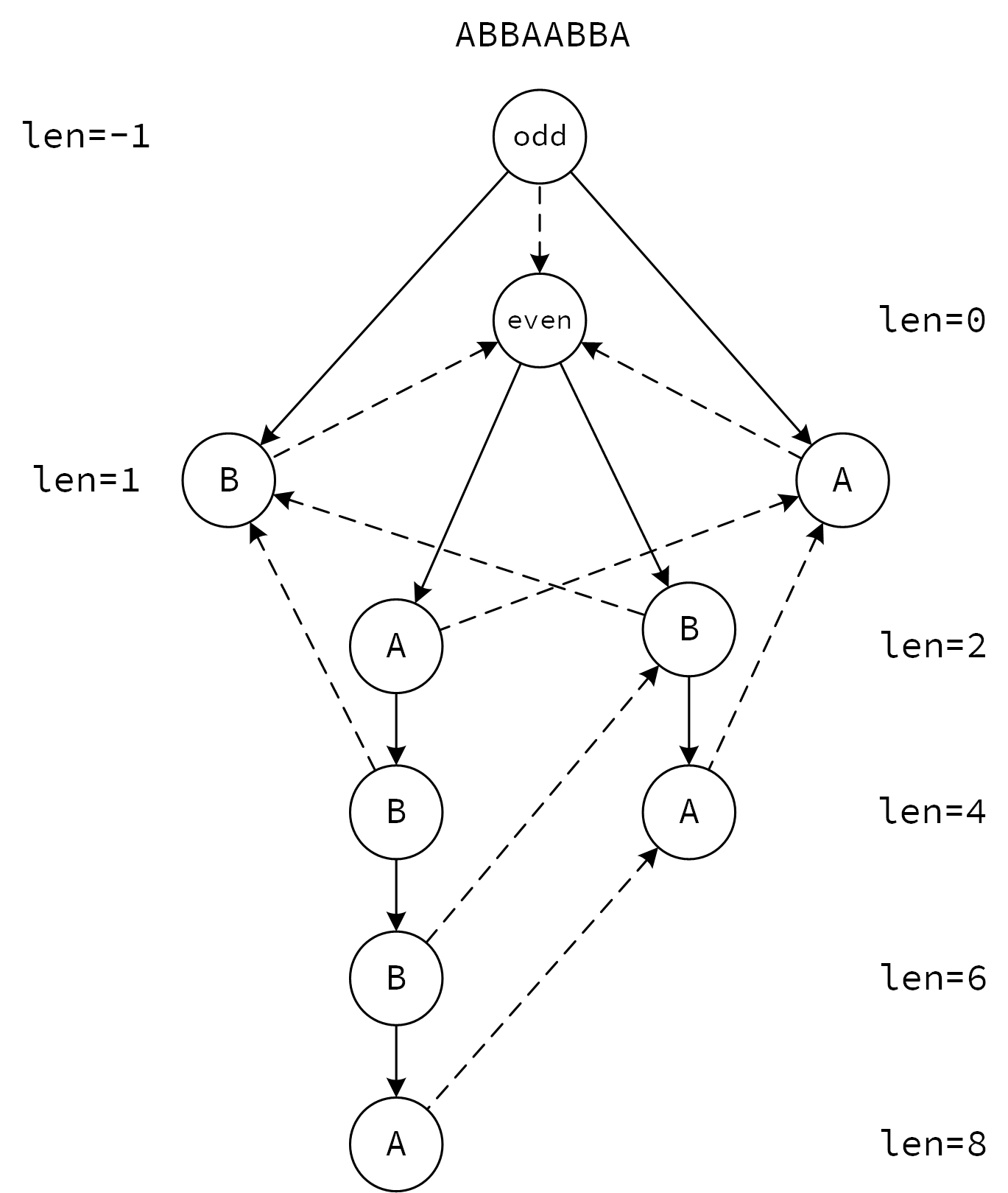 - 一个结点只表示一个回文串,这个特性会带来极大的方便。