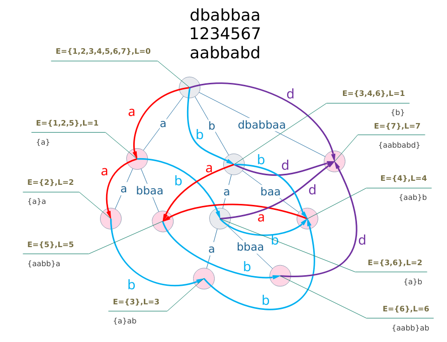 关键点(红色标记)自带一个 EndPos,然后每个结点的 EndPos 集合是自己和子节点的 EndPos 集合的并集,且子节点以及本身的 EndPos 集合之间没有交集。