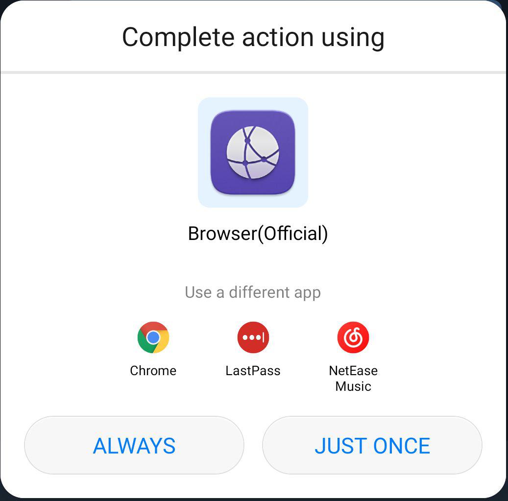 一个很简单的例子:点开一个应用中的链接,弹出选择浏览器,如图。在某次更新之前,它的所谓官方浏览器和其他图标是一样大且并列的,但是图中的导向更加明确了,虽然我选择 Chrome 的结果不会变,但令我极其不悦。